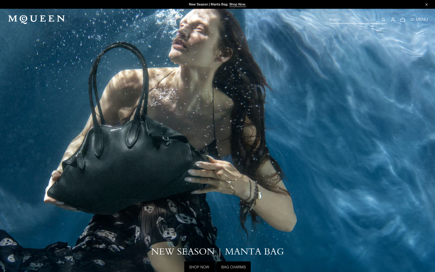 McQueen MQUEEN creates a haunting underwater luxury narrative through dramatic serif typography and oceanic blues. The brand merges high fashion with surreal aquatic imagery, using classical serif fonts to convey timeless elegance while subverting expectations with ethereal underwater photography.
