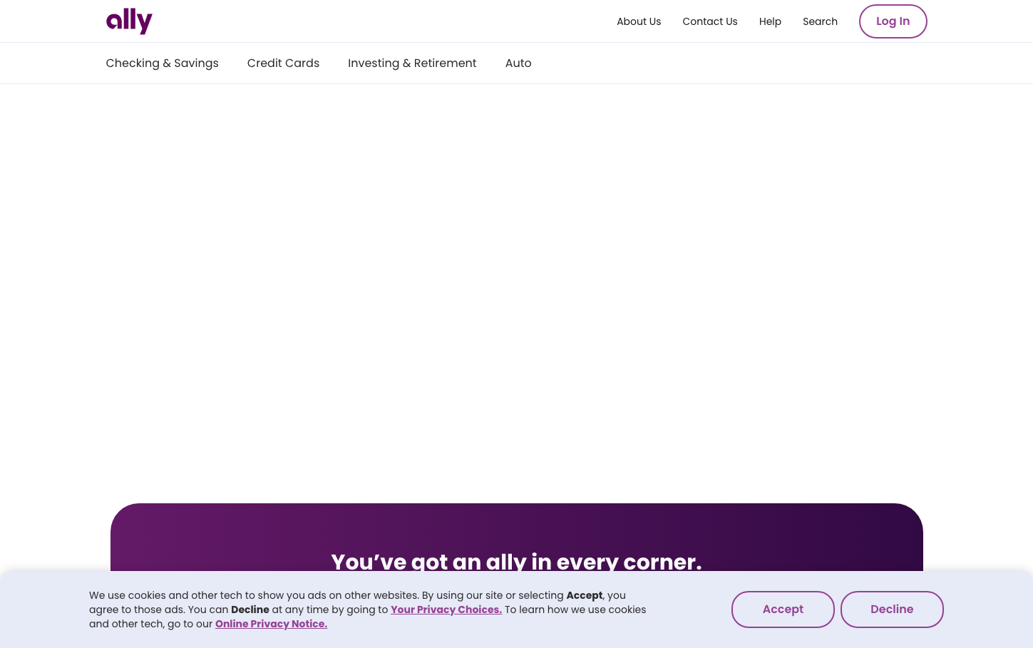 Ally Bank's brand exudes optimistic financial confidence through their signature warm purple (#922B96), creating an approachable yet professional atmosphere. The Poppins typography with its friendly geometric curves softens traditional banking severity, while the clean navigation and generous whitespace communicate trustworthy simplicity.