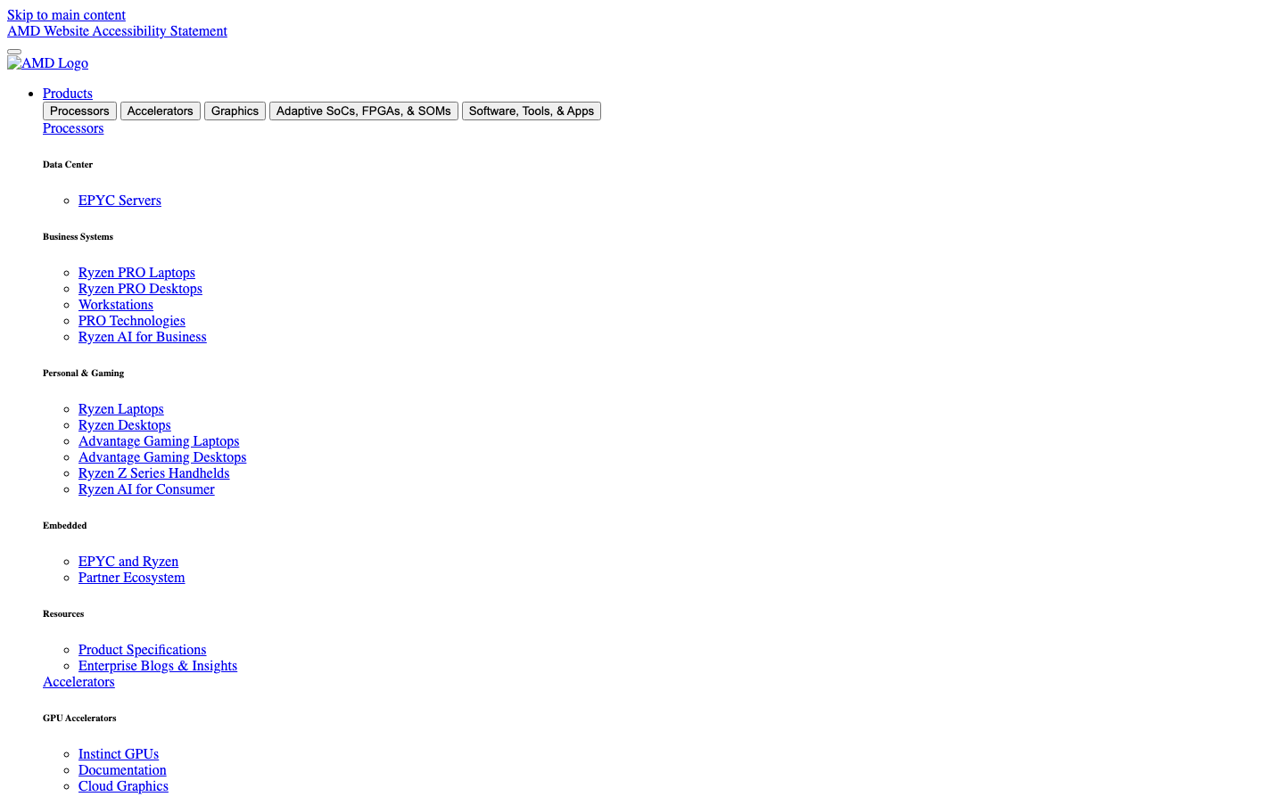 AMD's brand identity is rooted in utilitarian hierarchy and technical precision, using Times serif typography to convey established authority in semiconductor engineering. The stark, text-heavy navigation creates an encyclopedia-like atmosphere that prioritizes comprehensive product information over visual polish.