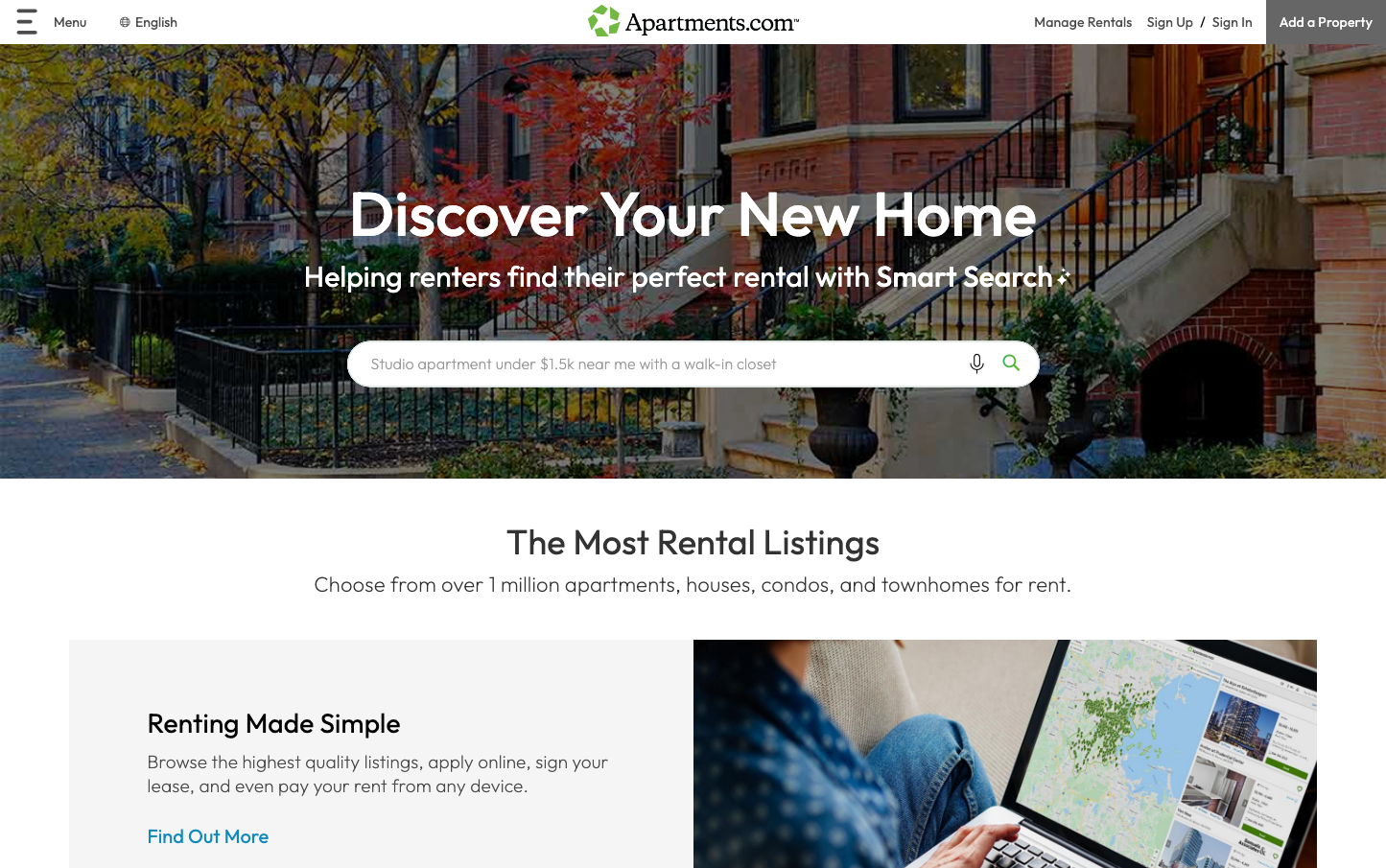 Apartments.com employs a forest-green signature color (#367b01) that communicates natural growth and housing stability, paired with custom CostarBrown typography that feels warm and residential rather than corporate. The hero layout creates an immersive neighborhood feeling with autumn-toned brick buildings that make apartment hunting feel like discovering a home community.