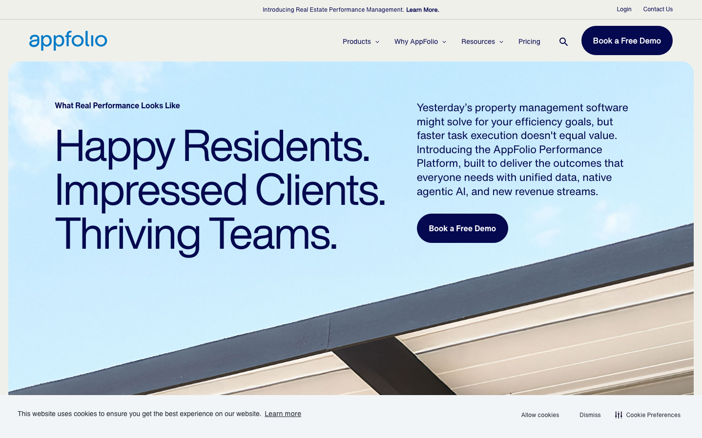 AppFolio presents a commanding, navy-anchored aesthetic that exudes enterprise-grade authority with approachable warmth. The massive Helvetica Now Display headlines create an imposing, institutional presence while the strategic use of bright sky blue accents prevents the design from feeling corporate-sterile. The composition balances serious B2B credibility with human-centered accessibility.