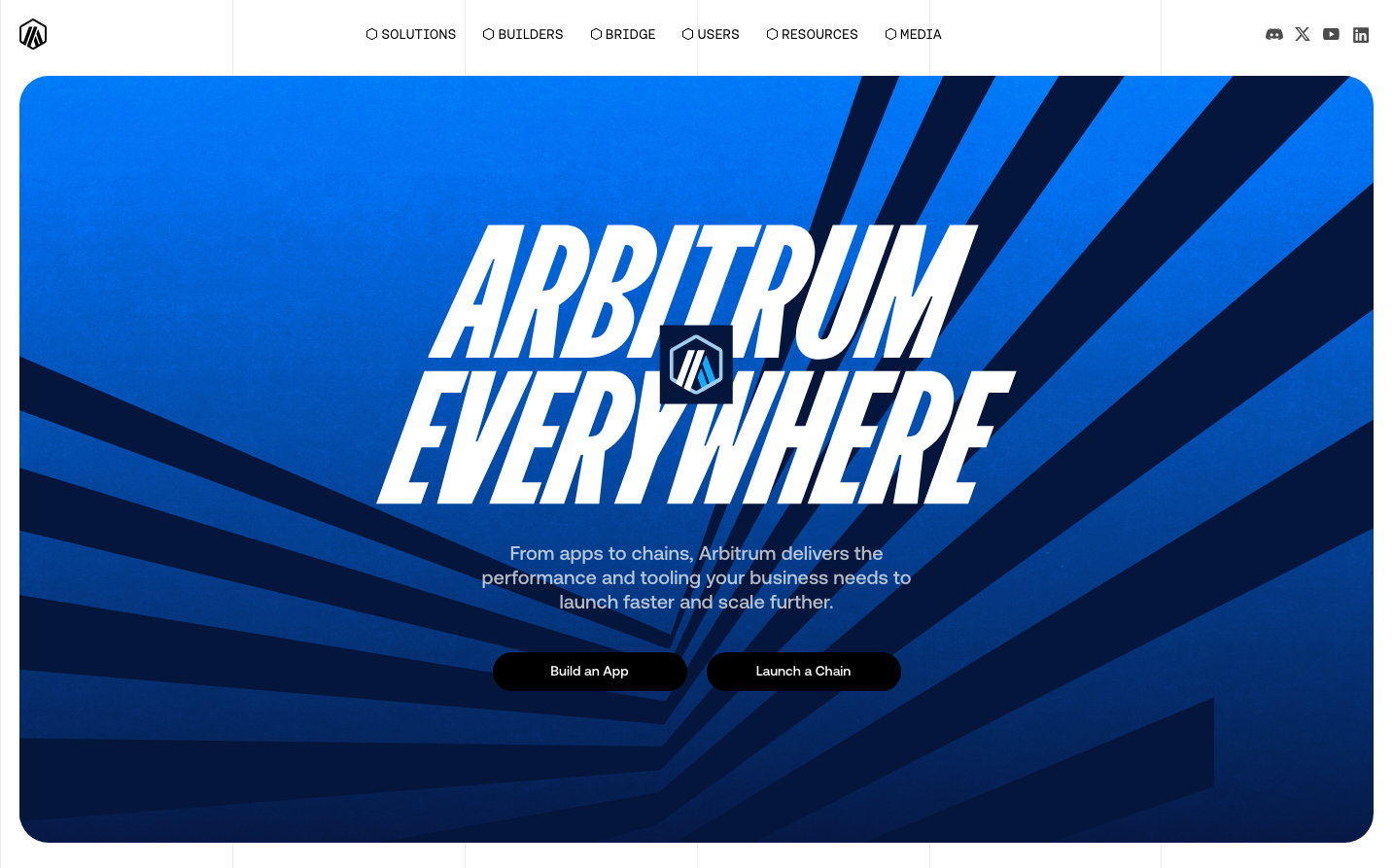 Arbitrum's visual identity centers around explosive energy and unstoppable momentum, using a dynamic sunburst pattern on intense blue gradients that radiates from behind bold, compressed typography. The design evokes the feeling of breaking through limitations with technological force, positioning blockchain infrastructure as a catalyst for explosive growth.