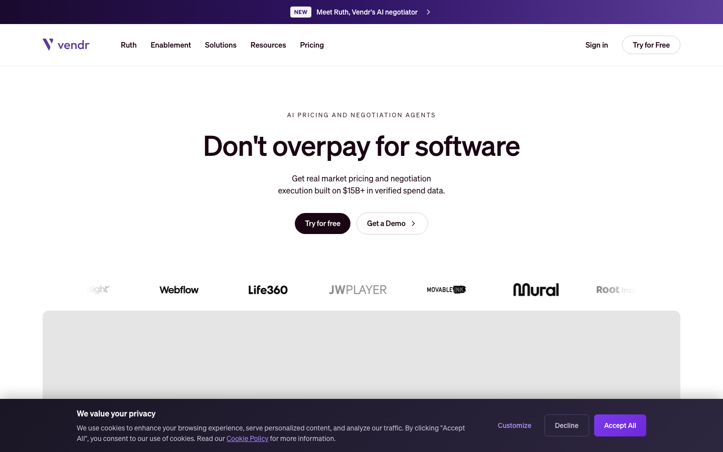 Vendr embodies corporate sophistication through its distinctive purple-dominated palette and refined typography hierarchy. The design exudes enterprise-grade trustworthiness while maintaining approachability through generous whitespace and elegant component styling.