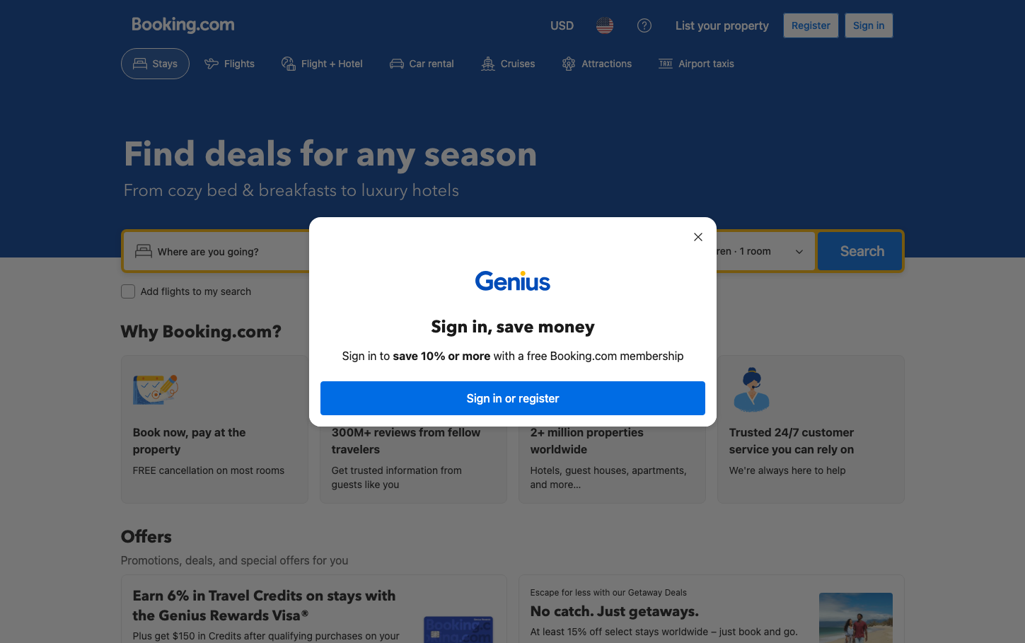 Booking.com employs a sophisticated dual-tone aesthetic that balances trustworthy deep navy backgrounds with crisp white content areas, creating a sense of premium reliability. The typography hierarchy mixing Avenir Next for headlines with system fonts for body text communicates both approachability and professional competence in the travel space.