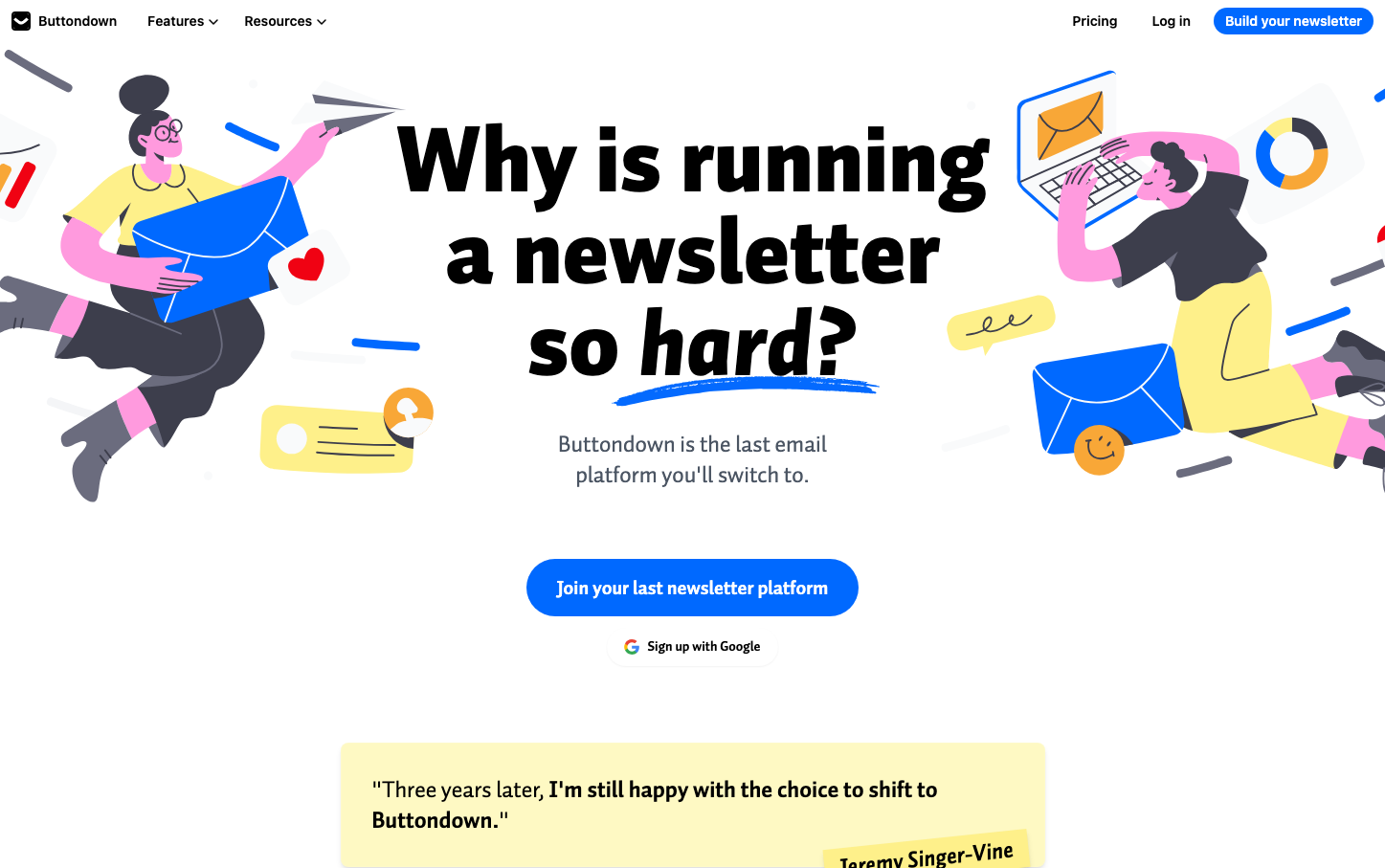 Buttondown embraces playful maximalism with bold hand-drawn illustrations that transform the sterile newsletter space into something joyful and approachable. The electric blue signature color cuts through chaotic, cartoon-like visuals while massive black typography creates confident hierarchy that feels both professional and whimsical.