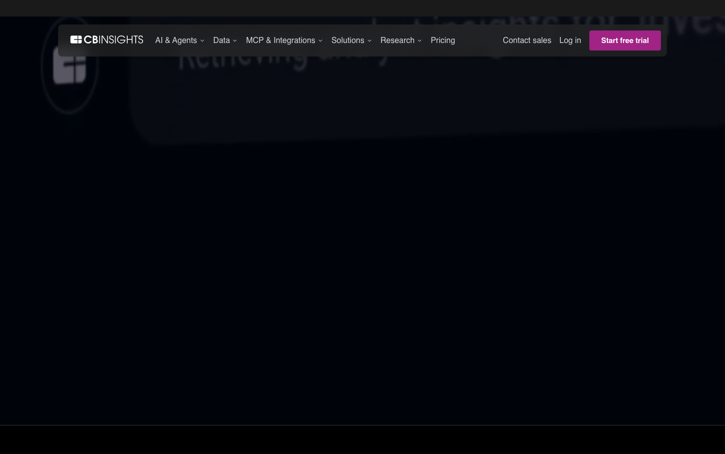 CB Insights commands a stark, institutional gravitas with its high-contrast navy-on-white palette and geometric precision. The typography hierarchy is brutally efficient - massive 64px headings that demand attention, paired with compact 14px body text that signals data density and professional urgency.