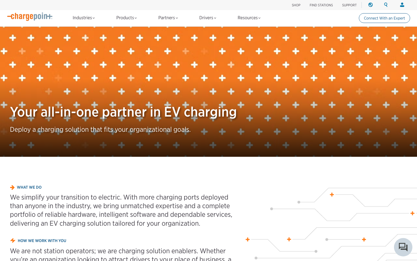 ChargePoint employs a bold orange gradient hero with an energetic plus-pattern overlay, paired with enterprise-grade Gotham Narrow typography. The brand balances electric enthusiasm with professional reliability, using warm oranges that evoke energy transition and innovation while maintaining corporate credibility.