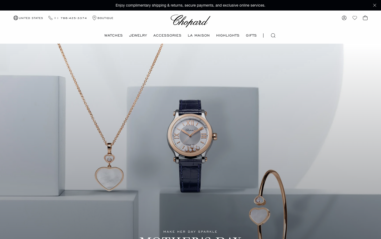 Chopard embodies Swiss luxury jewelry craftsmanship through dramatic theatrical lighting and pristine white gallery spaces that showcase their precious pieces like museum artifacts. The brand balances classical elegance with contemporary minimalism, using neutral tones and generous whitespace to let the jewelry's inherent beauty command attention.