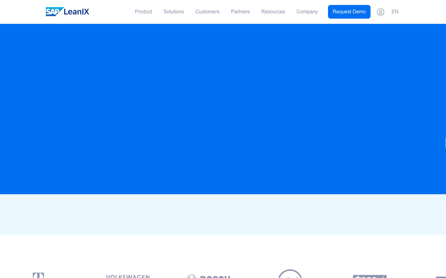 SAP LeanIX embodies enterprise authority through its commanding blue gradient that dominates the viewport, paired with the refined '72Brand' typography that signals SAP's design sophistication. The interface balances corporate gravitas with approachable usability, creating trust through visual stability rather than flashy innovation.