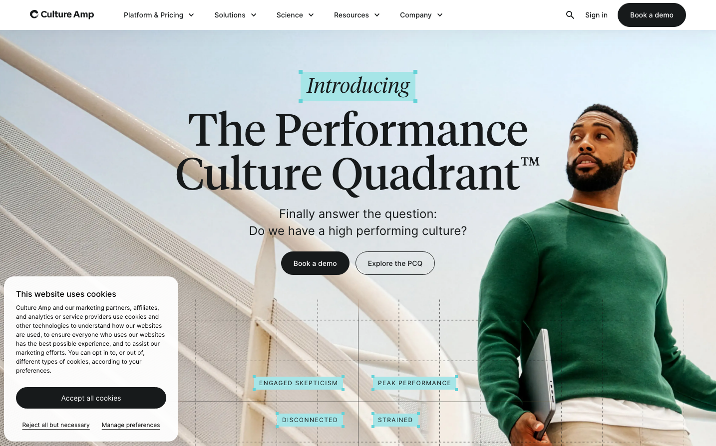 Culture Amp presents a sophisticated academic-meets-corporate identity that balances scholarly authority with progressive tech sensibilities. The Tiempos serif headlines create intellectual gravitas while Inter sans-serif body text maintains approachability, suggesting expertise that's accessible rather than intimidating.