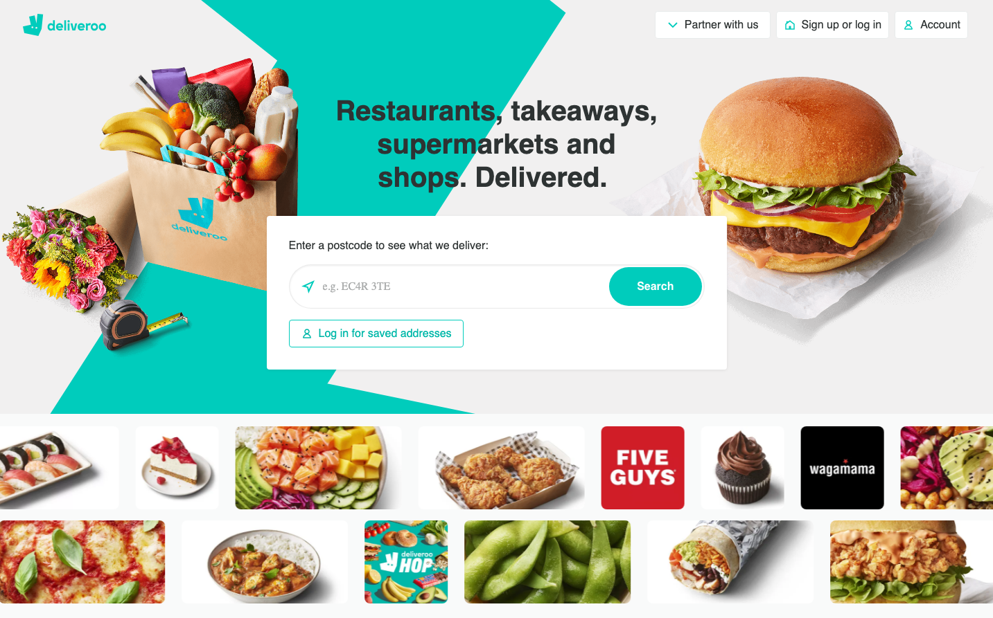 Deliveroo's brand radiates vibrant energy through its signature turquoise-teal that feels fresh and appetite-stimulating, perfectly balanced against warm food photography. The Stratos typography creates bold, confident headlines that feel approachable yet substantial, while the overall composition maintains an energetic, food-forward personality that makes delivery feel exciting rather than utilitarian.