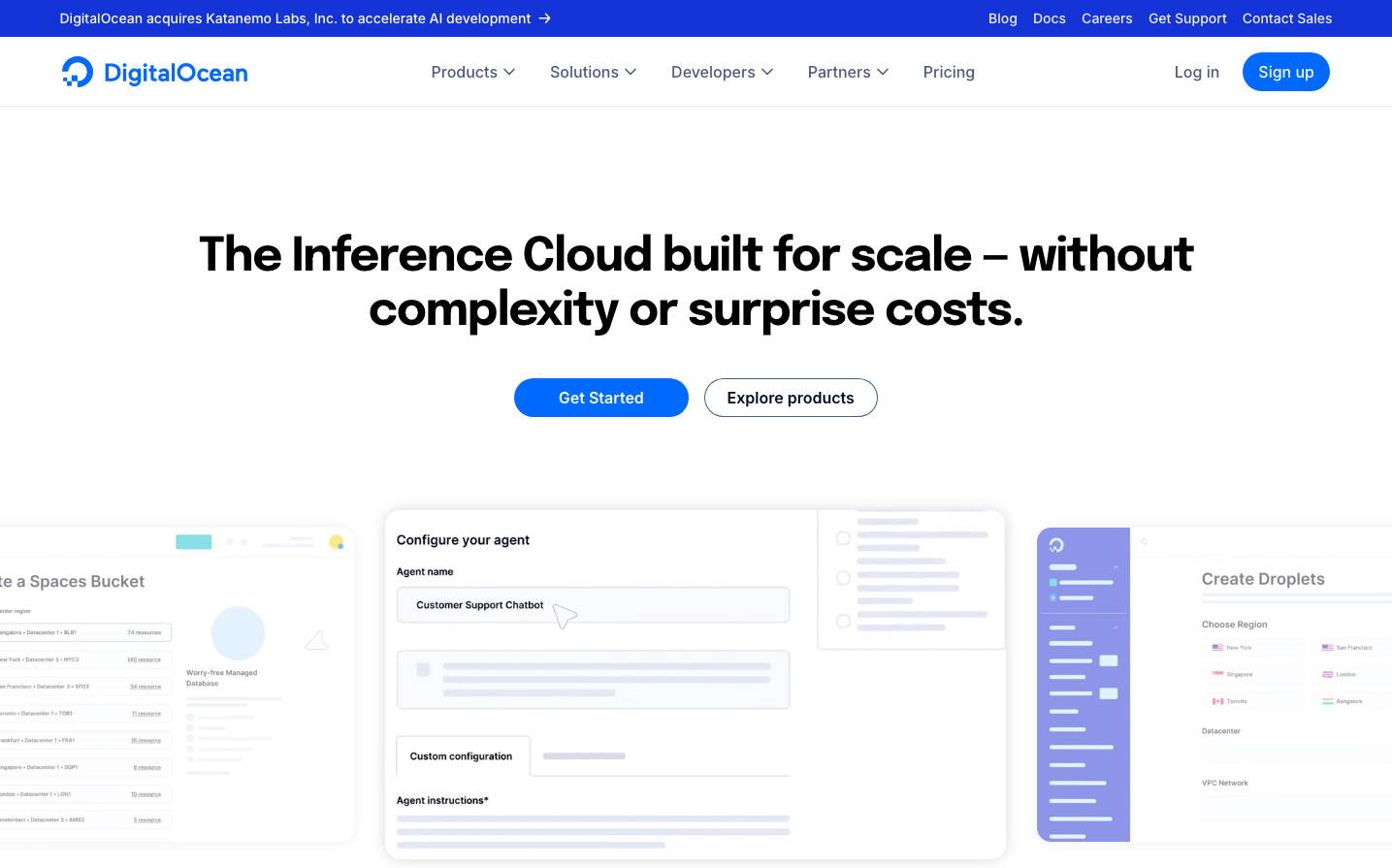 DigitalOcean embodies pragmatic developer confidence with its distinctive bright blue signature color that radiates accessibility over intimidation. The Epilogue headline font creates a friendly-yet-serious tone that says 'enterprise-capable but startup-approachable', while the clean interface mockups showcase infrastructure complexity made beautifully simple.