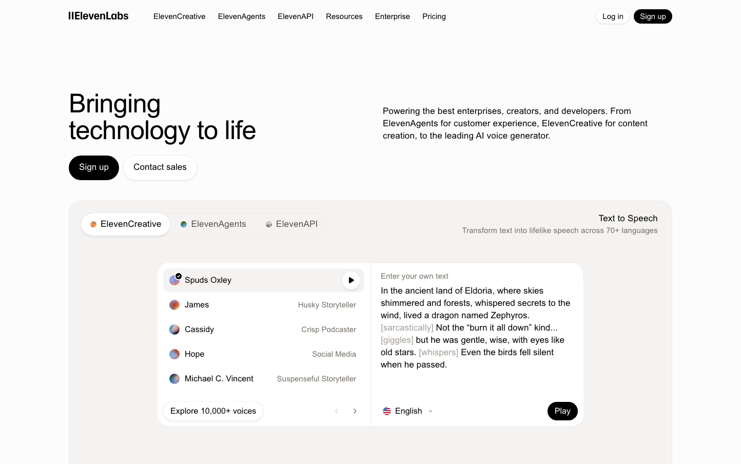 ElevenLabs embodies conversational AI sophistication through understated elegance - a whisper-white canvas that lets voice technology breathe. The Waldenburg custom typography creates intimate, human warmth while generous whitespace suggests the premium silence between spoken words.