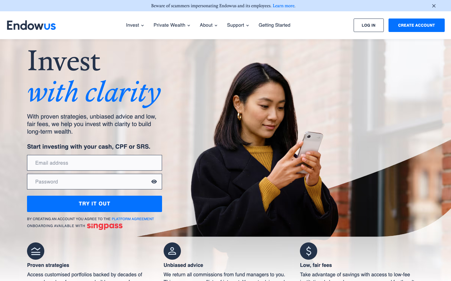 Endowus blends editorial sophistication with financial accessibility through its distinctive serif-sans typography pairing and calming blue-teal signature color. The design creates intellectual warmth - serious enough for wealth management yet approachable enough for everyday investors.