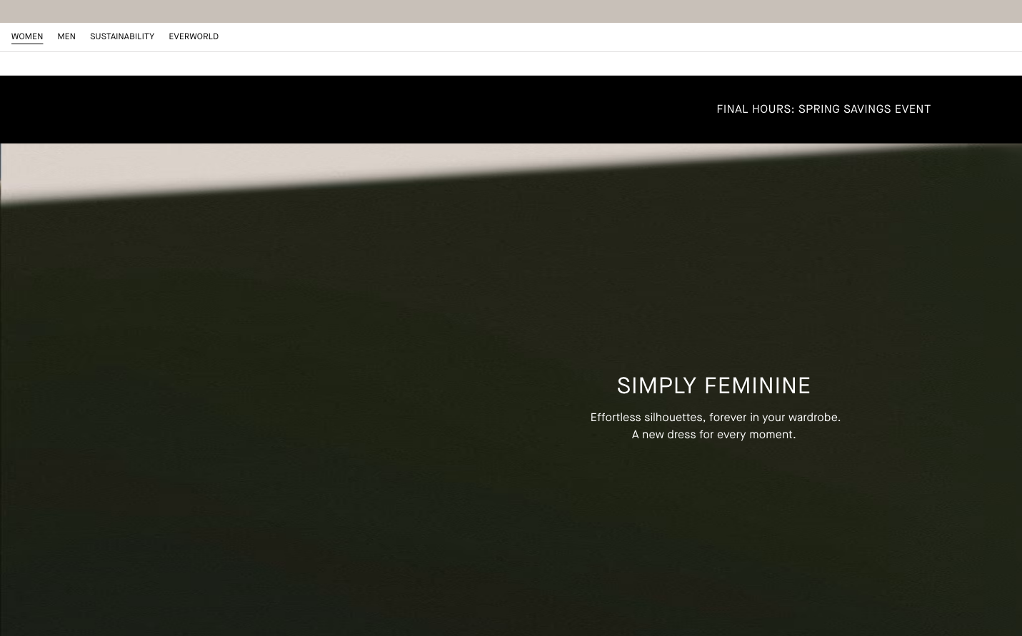 Everlane embodies editorial minimalism with cinematic drama through its signature dark olive-green overlays and whisper-light typography. The brand uses atmospheric photography as a canvas for sparse, contemplative text that feels like reading a thoughtful magazine rather than shopping online.
