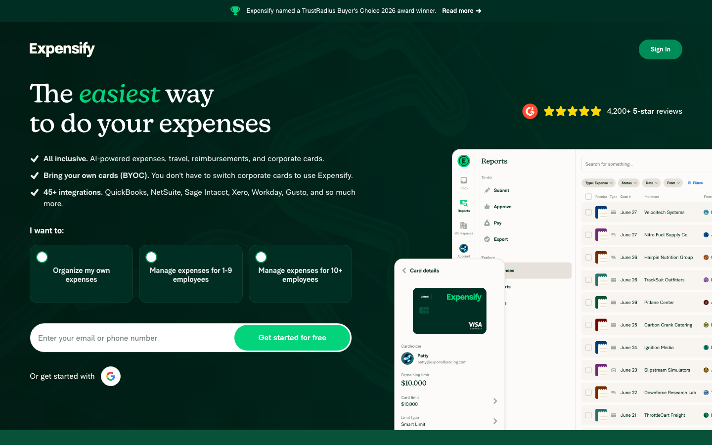 Expensify creates a sophisticated financial interface through rich forest greens and warm creams, evoking trust and organic growth. The dual typography system—mixing custom serif headlines with clean sans-serif UI text—suggests both authority and approachability, perfect for making expense management feel less corporate and more human.