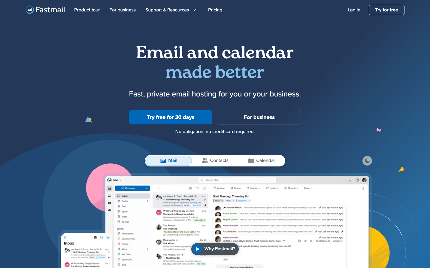Fastmail embraces a deep navy-blue nocturnal aesthetic that feels like premium nighttime productivity software. The elegant serif headlines paired with clean sans-serif body text creates a sophisticated yet approachable tone, suggesting serious email tools for discerning professionals.