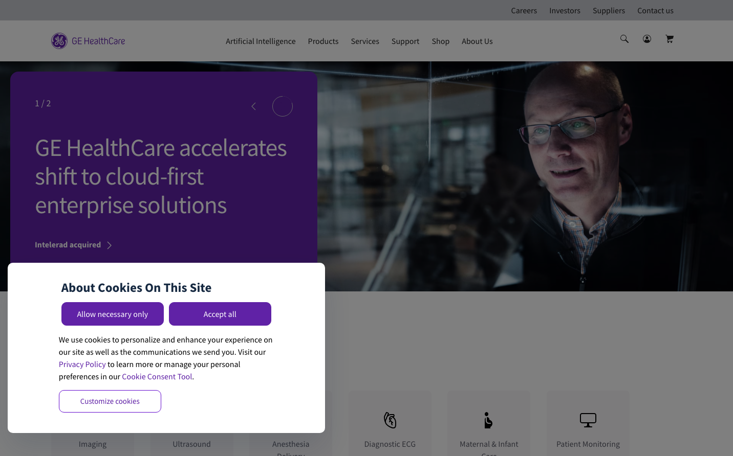 GE Healthcare embodies a clinical-meets-digital aesthetic with its commanding purple-to-navy gradient overlays that create dramatic, almost cinematic depth. The typography is deliberately understated with Source Sans Pro, allowing the bold gradient messaging to dominate while maintaining medical-grade trustworthiness.