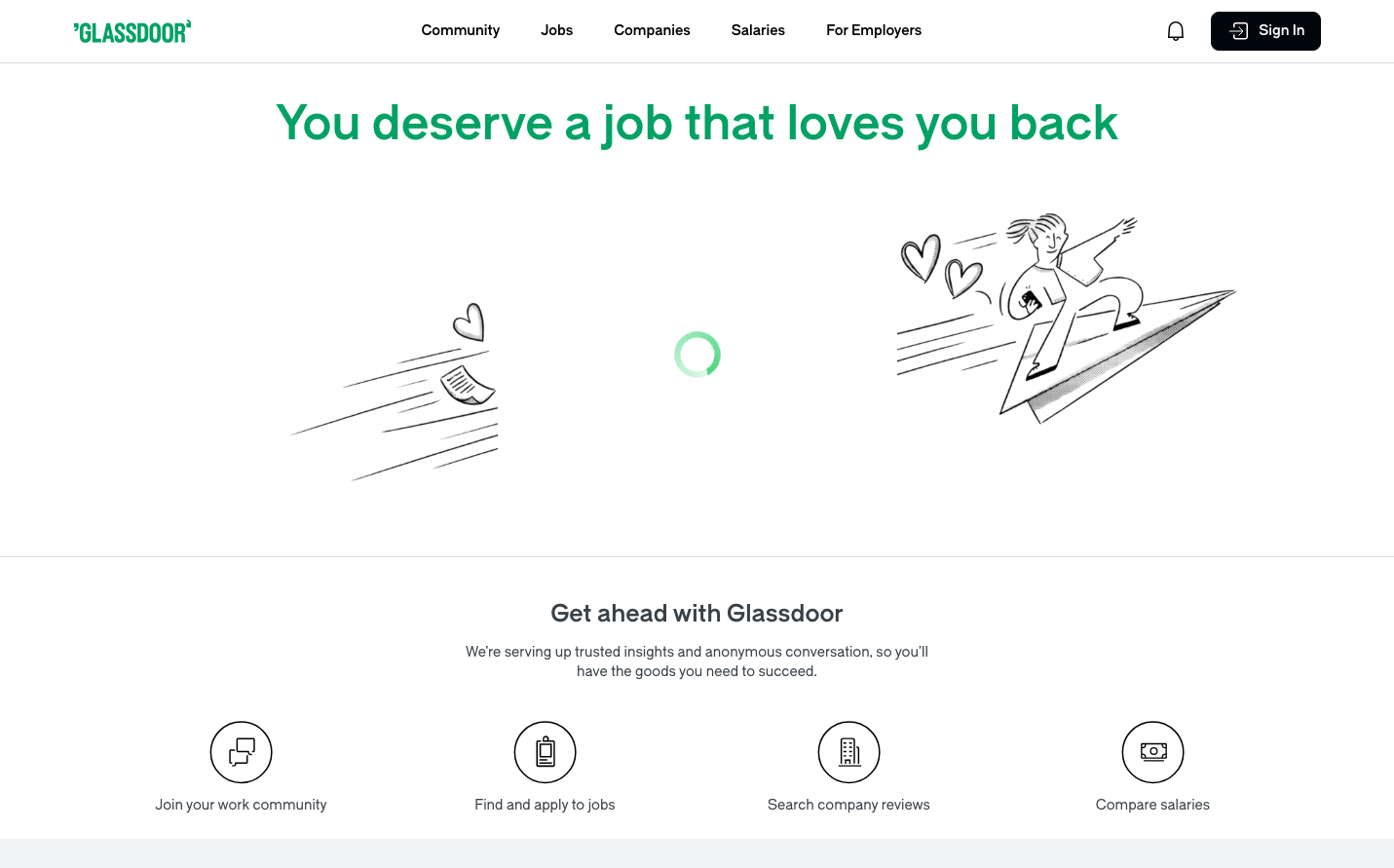 Glassdoor's brand radiates career optimism through its distinctive mint-green signature color and joyful hand-drawn illustrations. The design balances professional credibility with human warmth, using generous whitespace and whimsical line art to make job searching feel hopeful rather than stressful.