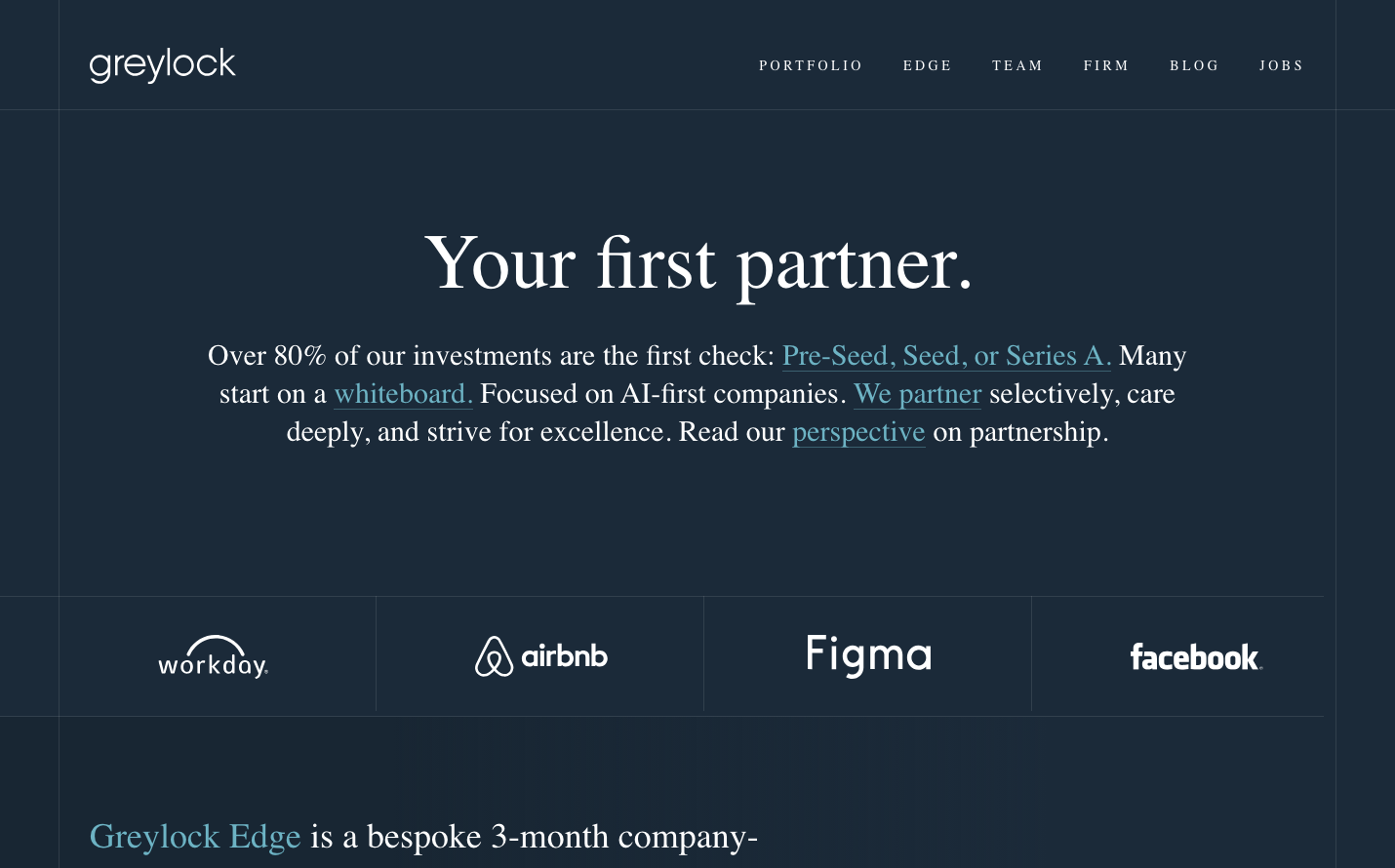Greylock embodies sophisticated venture capital gravitas with a midnight navy backdrop that evokes late-night founder conversations and boardroom confidentiality. The Miller Display serif headlines create an editorial luxury reminiscent of financial publications, while the constellation of portfolio logos floats like prestigious trophies in the darkness.