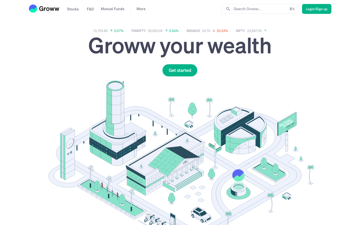 Groww creates a playful yet sophisticated fintech identity through mint-green isometric illustrations and premium typography. The Soehne typeface for headlines evokes editorial sophistication while the bright green palette feels optimistic and accessible rather than intimidating.