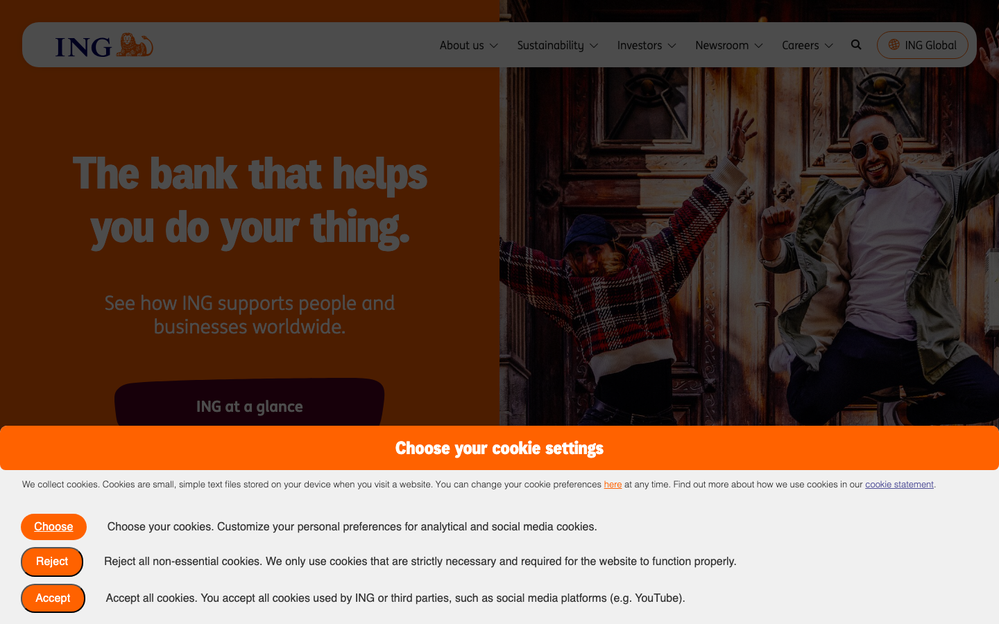 ING's brand radiates approachable warmth through vibrant orange gradients paired with sophisticated purple accents, creating a confident yet human financial experience. The custom INGDisplay typography delivers bold, friendly messaging that breaks away from sterile banking conventions.