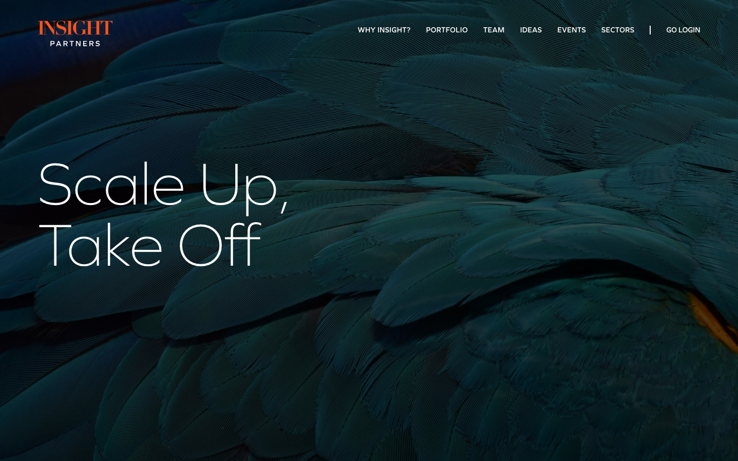 Insight Partners embodies venture capital sophistication through ultra-thin typography that whispers authority rather than shouting it. The deep teal-black gradient background creates an oceanic depth that suggests vast financial resources, while the minimal white text floats with the confidence of established power.