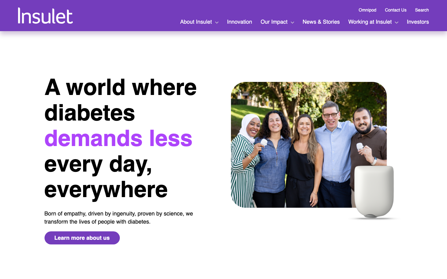 Insulet embodies warm healthcare optimism through its signature vibrant purple that feels approachable yet authoritative. The design balances personal connection with medical credibility, using generous whitespace and human-centered imagery to make diabetes management feel less clinical and more empowering.