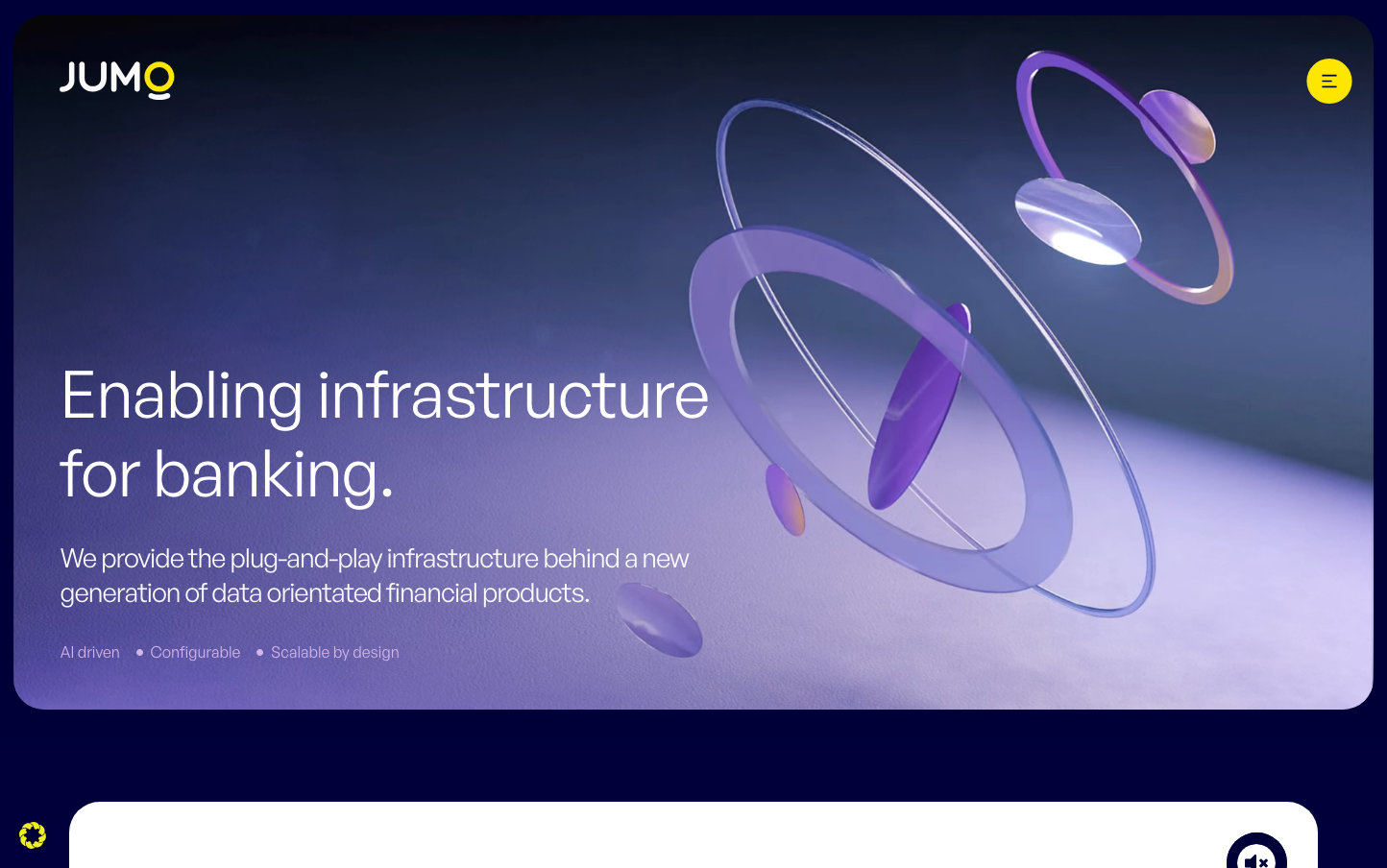 JUMO embodies a nocturnal fintech aesthetic with a deep space gradient that transitions from midnight navy to cosmic purple, punctuated by translucent 3D orbital elements that suggest data flow and financial connectivity. The typography uses General Sans with generous spacing, creating an enterprise-grade sophistication that feels both approachable and technically advanced.