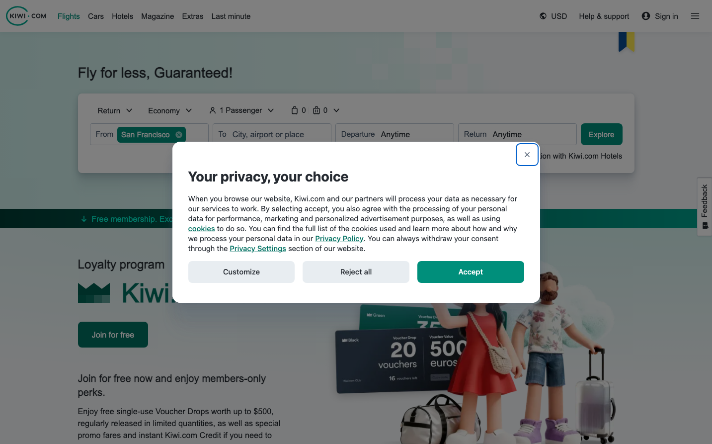 Kiwi.com presents a friendly yet professional travel experience through its signature teal-green palette that evokes trust and adventure. The approachable Circular typeface combined with soft, rounded corners creates a welcoming atmosphere for budget-conscious travelers seeking reliable booking experiences.