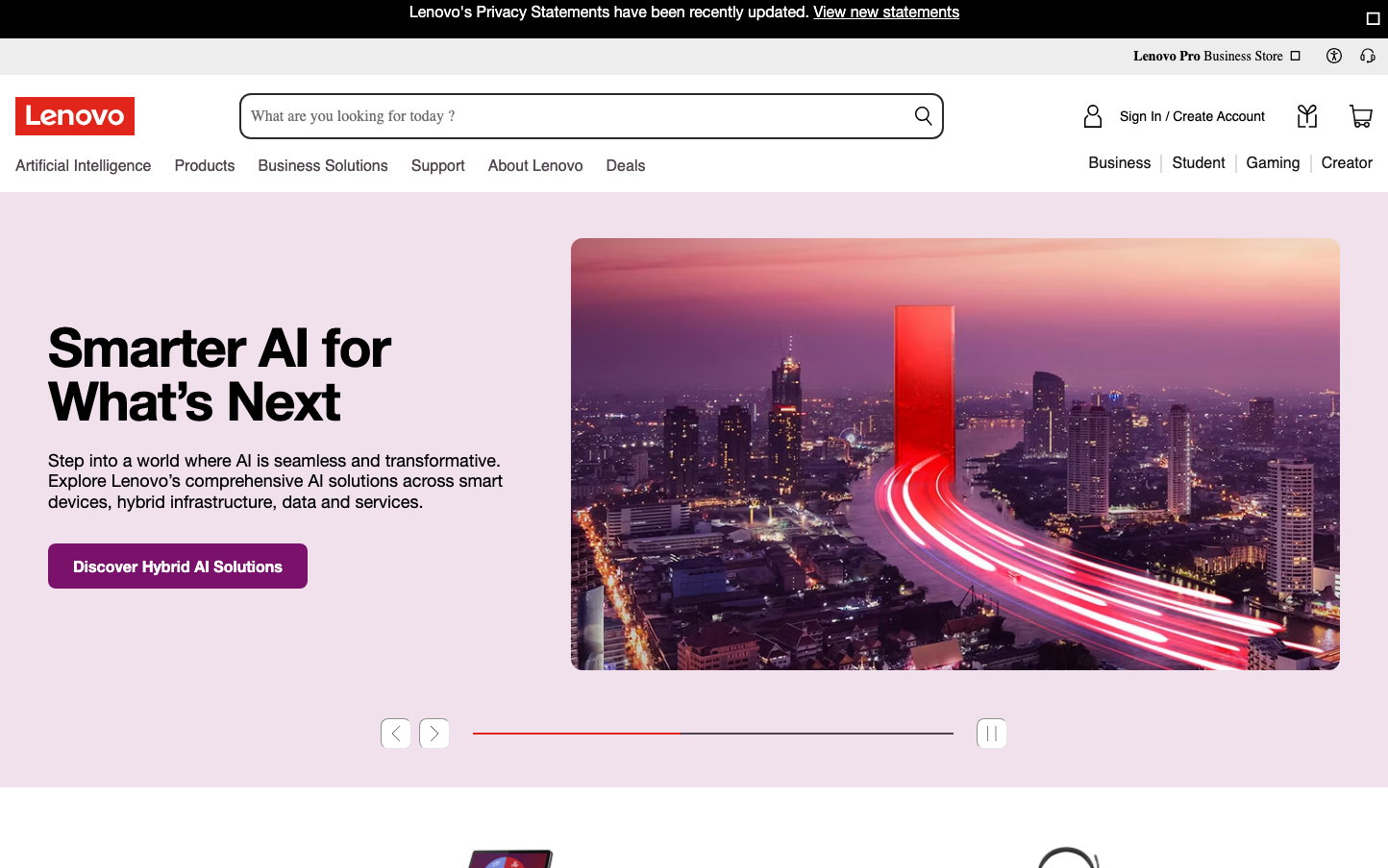 Lenovo presents a tech-forward enterprise aesthetic where bold Montserrat typography creates authoritative headlines against atmospheric cityscapes. The design balances corporate professionalism with dynamic energy through neon-like AI visualizations and gradient overlays that suggest innovation and forward momentum.