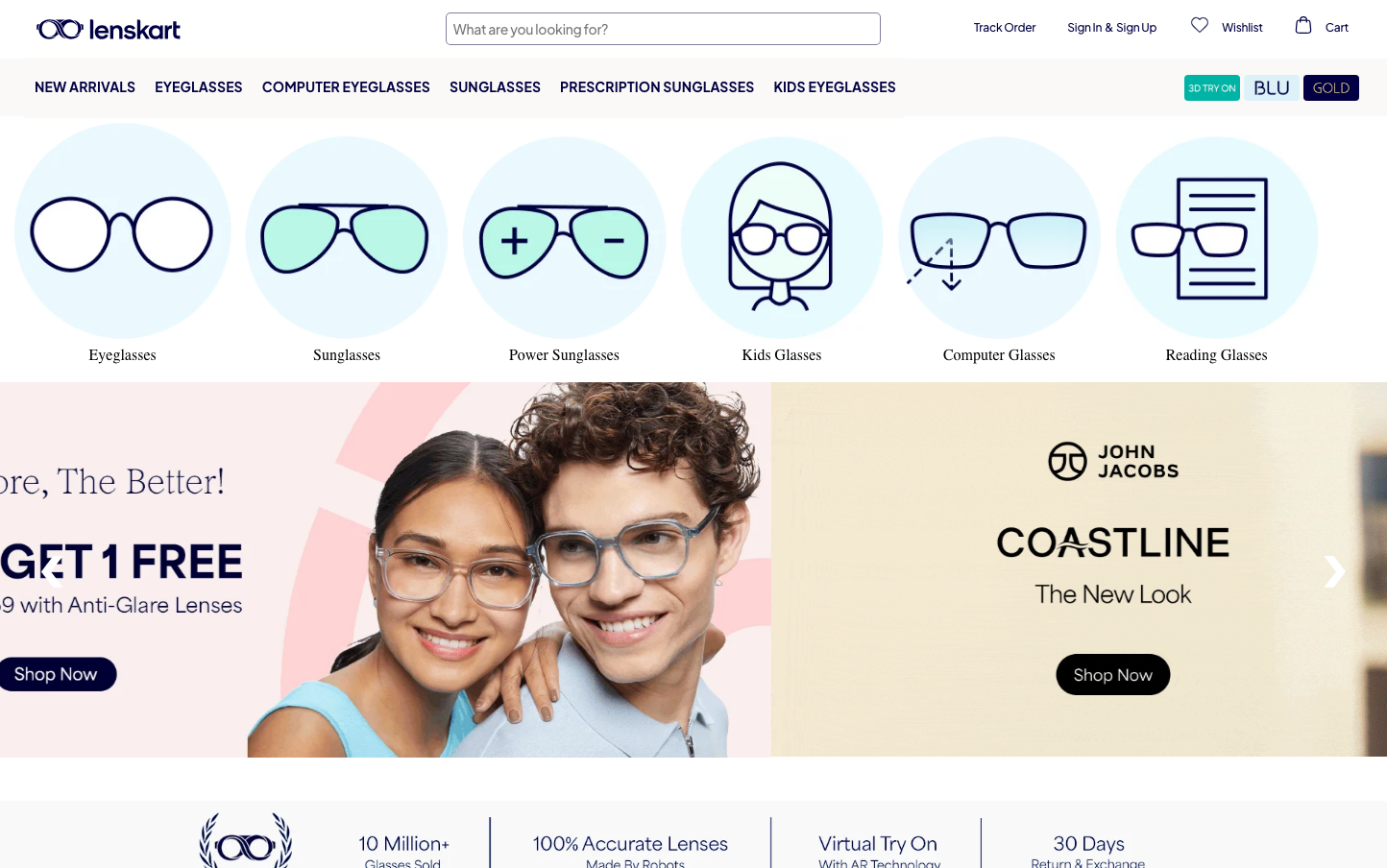 Lenskart embraces an approachable healthcare aesthetic with soft, rounded iconography and gentle visual hierarchy. The design balances medical precision with consumer friendliness through minimalist illustrations and subtle color accents that make eyewear shopping feel welcoming rather than clinical.