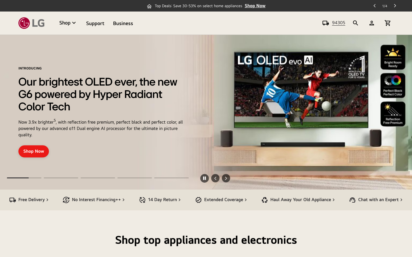 LG's brand identity balances premium technology storytelling with approachable warmth through dramatic product showcases and custom LGEI typography. The aesthetic emphasizes visual-first communication where large hero imagery dominates, supported by clean technical copy that positions products as lifestyle solutions rather than mere appliances.