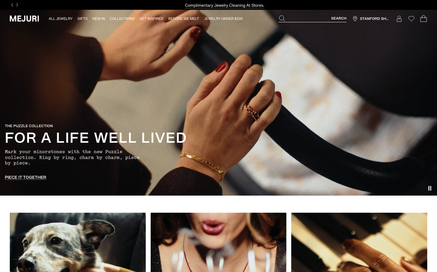 Mejuri creates an intimate, elevated jewelry experience through dramatic contrast between warm gold tones and deep black backgrounds. The monospace 'PIECE IT TOGETHER' call-to-action paired with elegant sans-serif headlines creates a unique tension between technical precision and luxury craftsmanship.