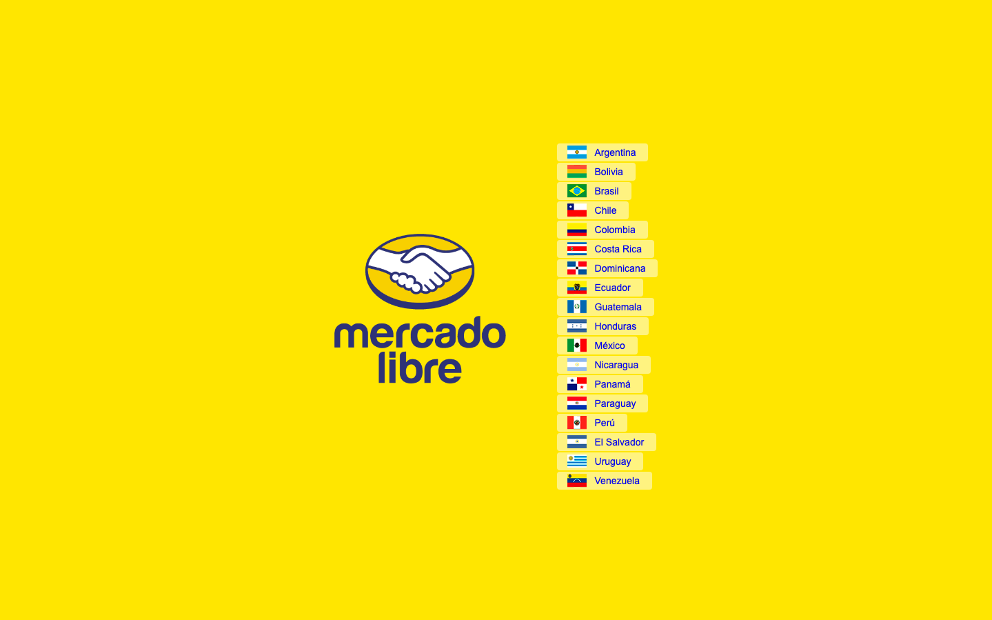 MercadoLibre's brand radiates Latin American warmth and accessibility through its iconic sunshine yellow that dominates the entire visual field. The design feels approachable and democratic, using straightforward typography and a comprehensive flag system that celebrates regional diversity while maintaining unity through color.
