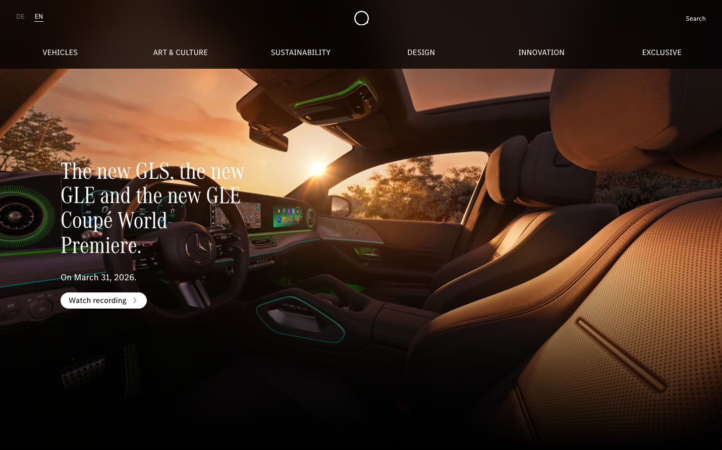 Mercedes-Benz creates a cinematic, premium automotive experience through dramatic warm-toned photography contrasted against stark black navigation. The custom MBCorpo Text typography establishes sophisticated corporate authority while maintaining accessibility, with the overall aesthetic evoking the golden hour luxury of high-end automotive marketing.