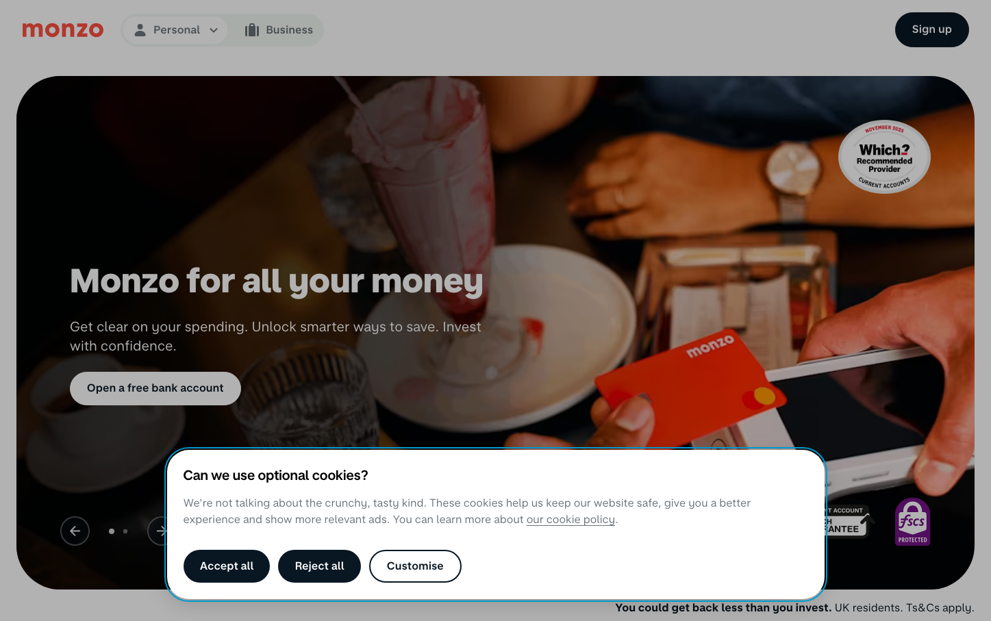 Monzo's brand radiates warmth through its signature coral-orange card contrasted against moody, intimate photography. The custom MonzoSans typography feels approachable yet confident, while the lifestyle imagery creates an emotional connection around everyday financial moments.