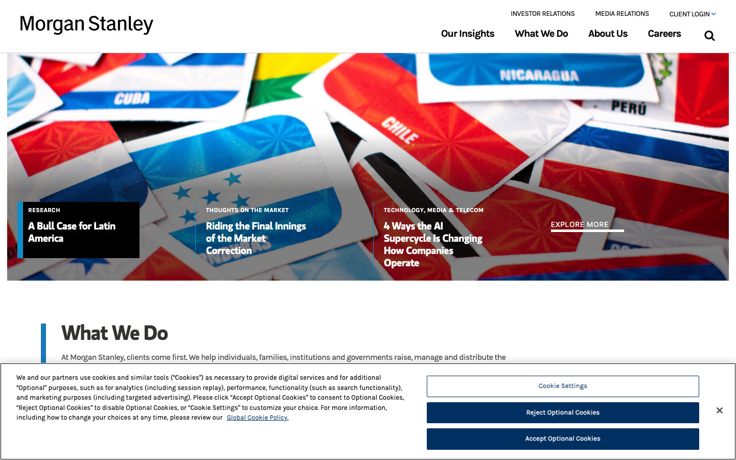 Morgan Stanley projects institutional gravitas through a sophisticated blend of serif elegance and sans-serif accessibility, creating an atmosphere of established financial authority. The typography hierarchy mixing Times with custom Gloriola and Karla fonts signals both heritage and contemporary expertise, while the vibrant flags imagery suggests global reach and cultural intelligence.