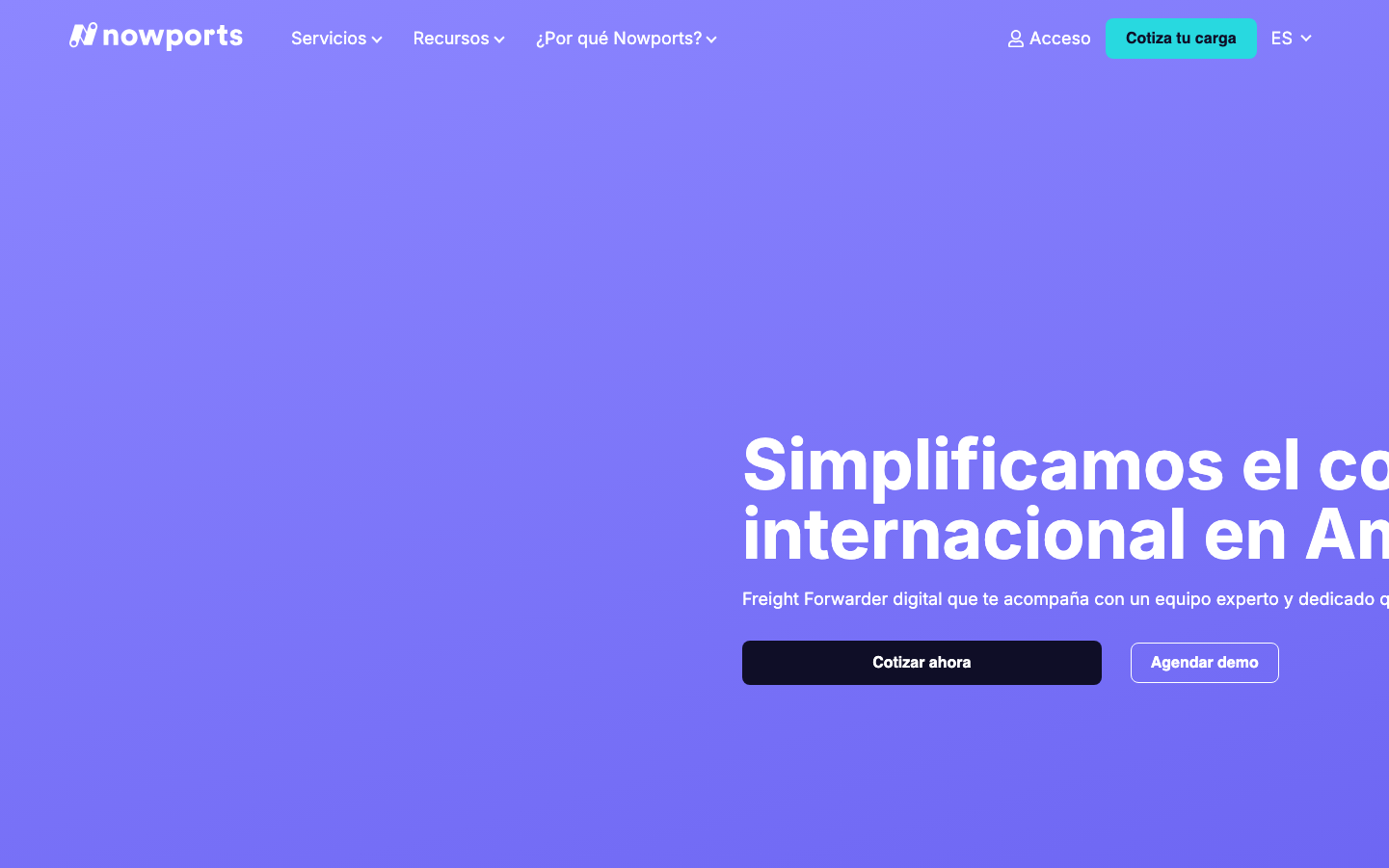 Nowports embraces a bold, immersive approach with a dominant purple gradient background that creates an ethereal, tech-forward atmosphere. The stark white typography against the purple void feels confident and aspirational, suggesting a digital-first logistics platform that operates beyond traditional boundaries.