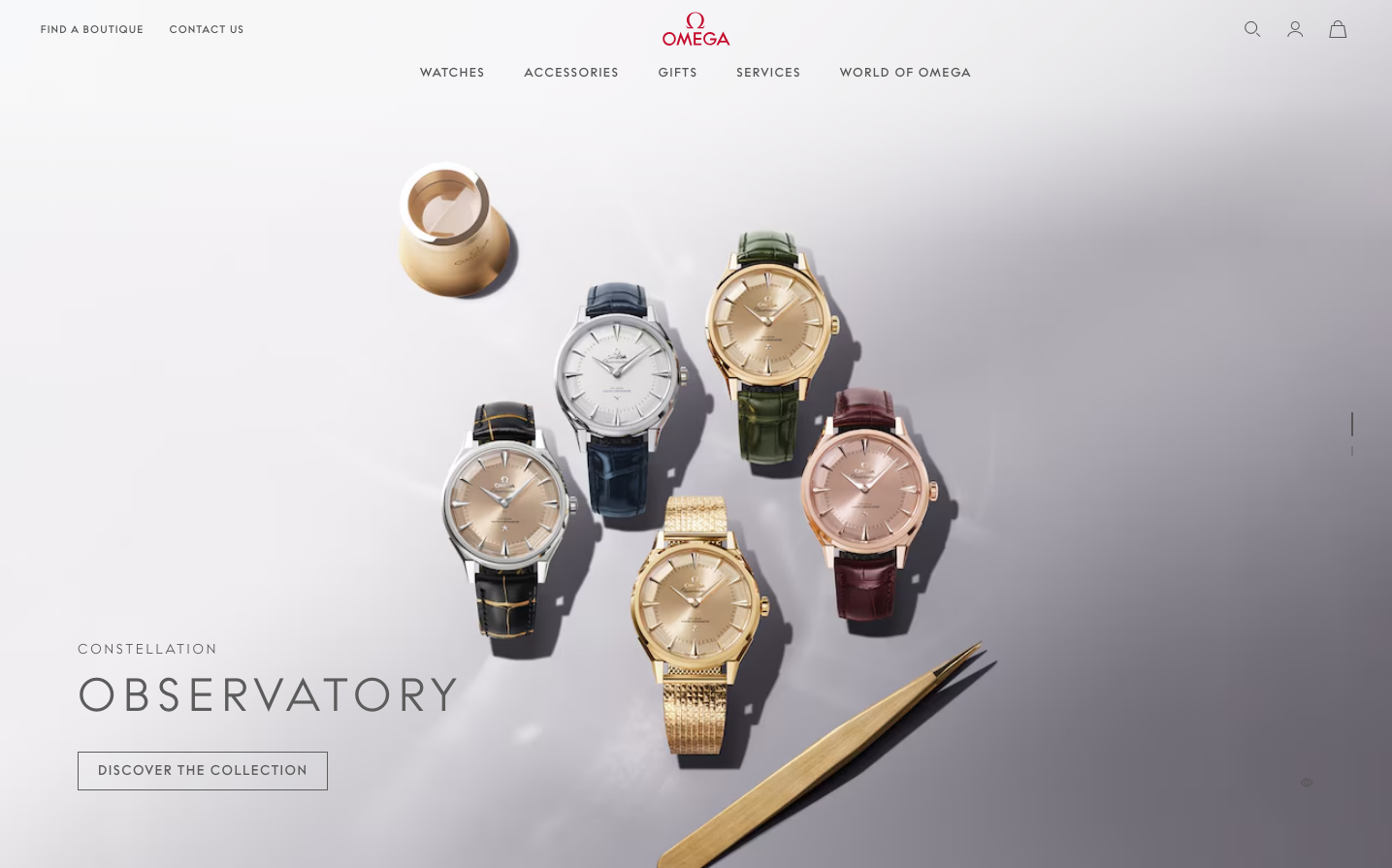 Omega embodies sophisticated horological heritage through ultra-refined typography and museum-quality spacing that lets each timepiece breathe. The monochromatic palette with warm gold accents evokes Swiss precision and understated luxury, while the minimalist layout creates an almost gallery-like reverence for craftsmanship.
