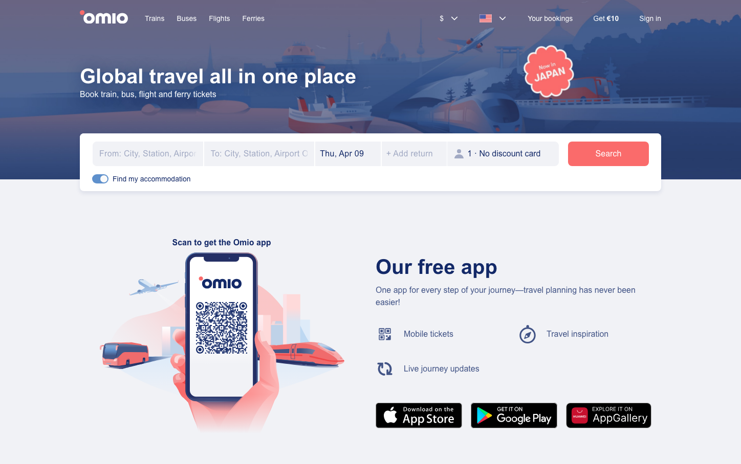 Omio creates a dreamy, wanderlust-inducing aesthetic through a dramatic twilight gradient backdrop that transitions from deep purple to warm coral, overlaid with illustrated transportation modes. The GT Walsheim typography feels approachable yet sophisticated, balancing travel excitement with booking confidence through generous whitespace and a floating search interface.