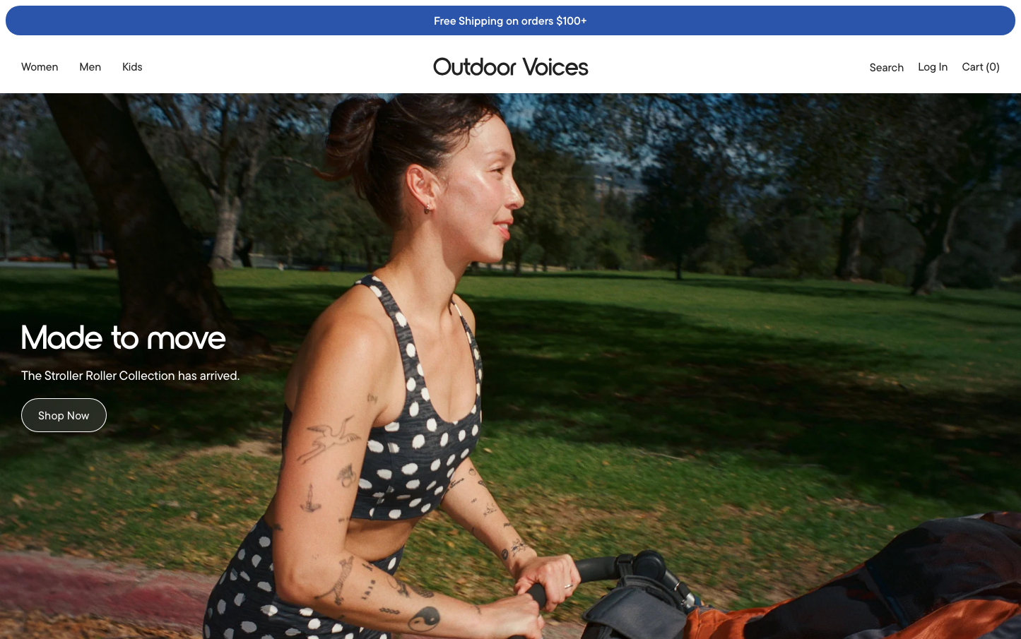 Outdoor Voices embraces understated athleticism with a sophisticated grayscale palette that evokes mindful movement rather than aggressive competition. The TTCommonsPro and NordiquePro typography creates a refined, almost editorial feel that elevates activewear into lifestyle territory.