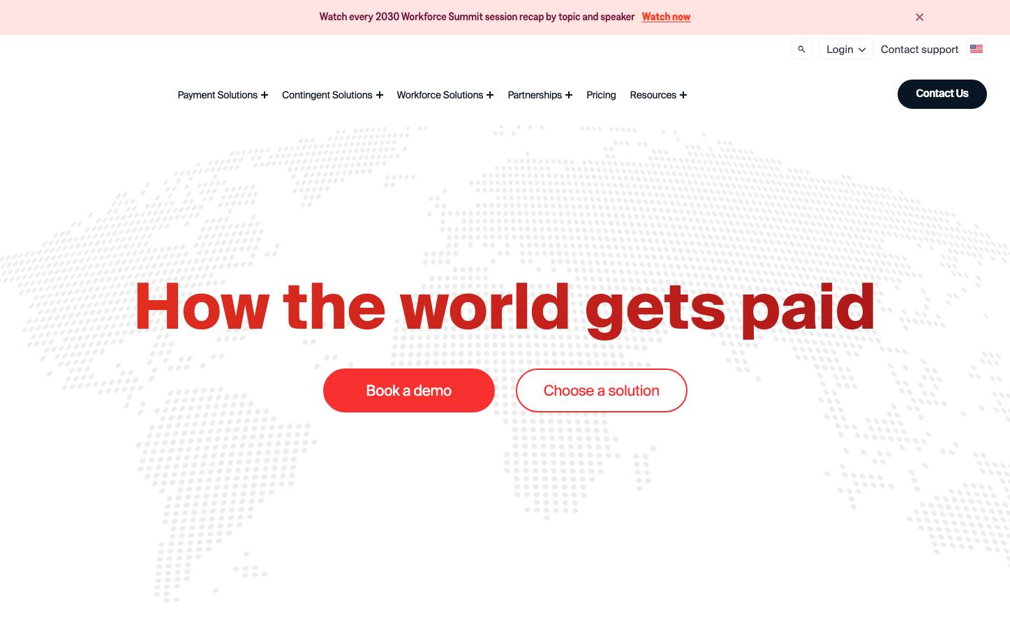 Papaya Global commands attention with massive, bold headlines in Suisse typeface that create an almost architectural presence on the page. The striking red (#E53E3E) hero text against a subtle world map background evokes urgency and global reach, while the clean navigation maintains professional restraint.