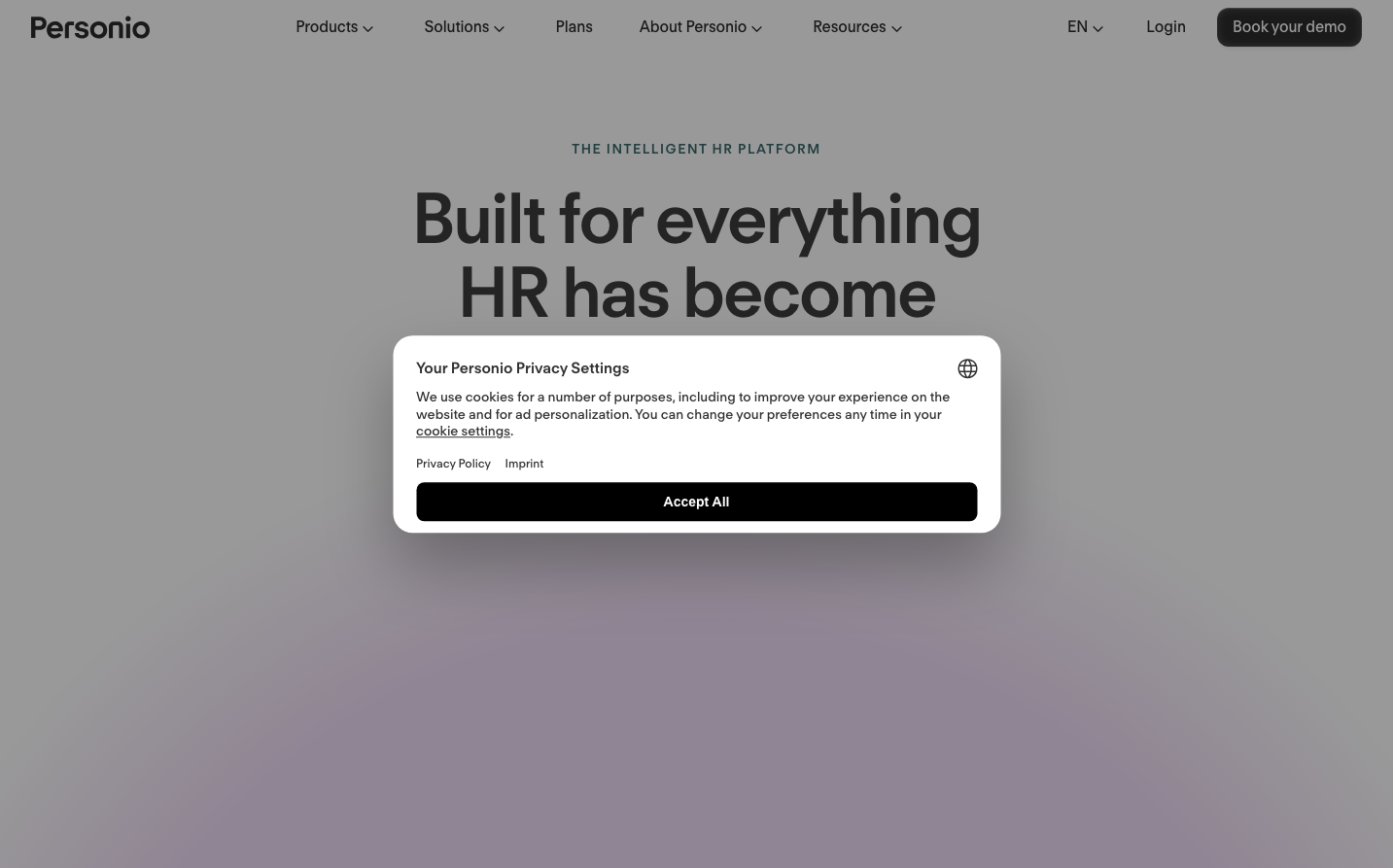 Personio creates an atmosphere of sophisticated minimalism through its custom 'regolaNeue' typeface that balances approachability with authority. The dramatic gradient background and centered hero layout suggest premium enterprise software that prioritizes clarity over visual noise.