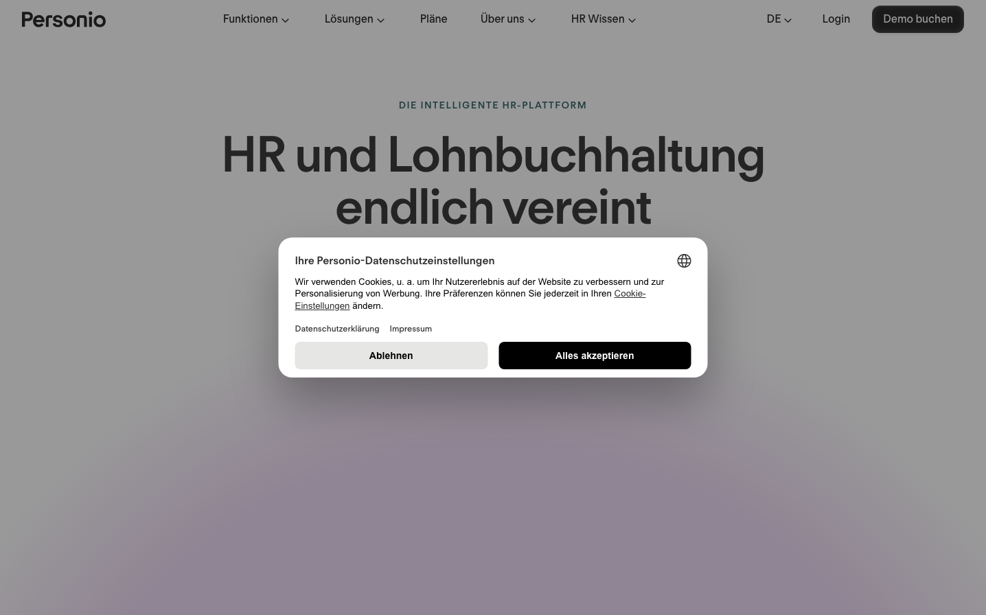 Personio projects enterprise-grade sophistication through dramatic high-contrast gradients and bold typography hierarchy. The regolaNeue typeface creates a distinctly European professional aesthetic that feels more humanized than typical corporate sans-serifs, while the dark atmospheric backgrounds convey premium B2B positioning.