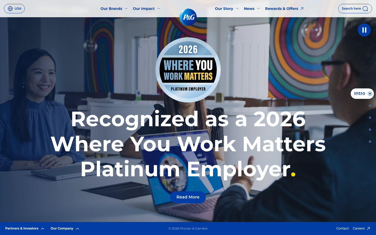 P&G's brand identity combines corporate sophistication with human warmth through a distinctive dual-typography system - geometric Montserrat for impact and traditional Times for approachability. The signature P&G blue creates trust and reliability while vibrant swirling graphics add energy and optimism, balancing professional authority with inclusive accessibility.