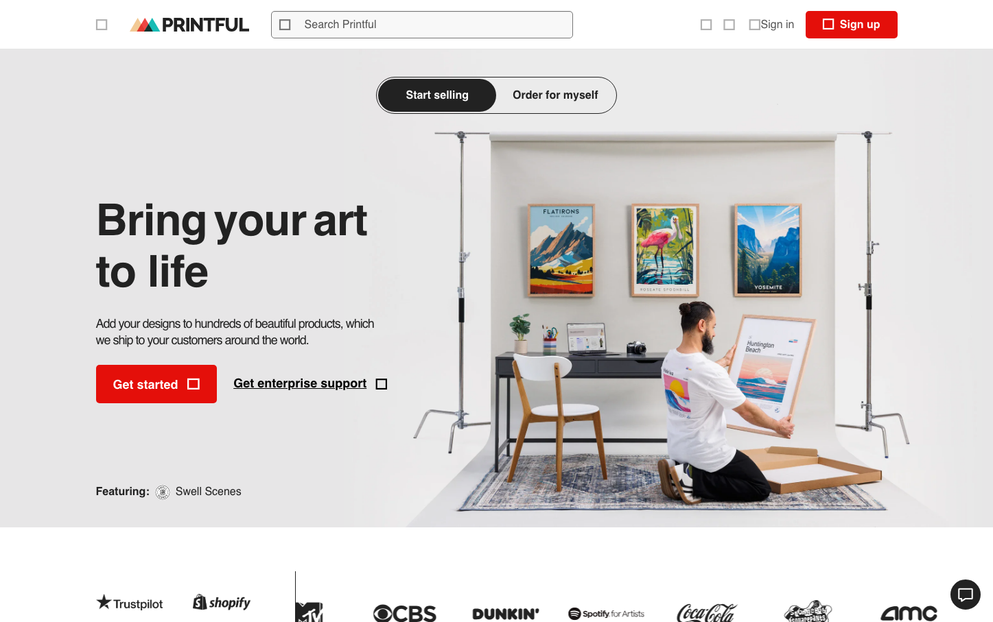 Printful's brand radiates creative empowerment through bold red accents against soft, studio-like neutrals. The typography hierarchy using ProximaNova creates a confident yet approachable voice that speaks to artists ready to monetize their craft.