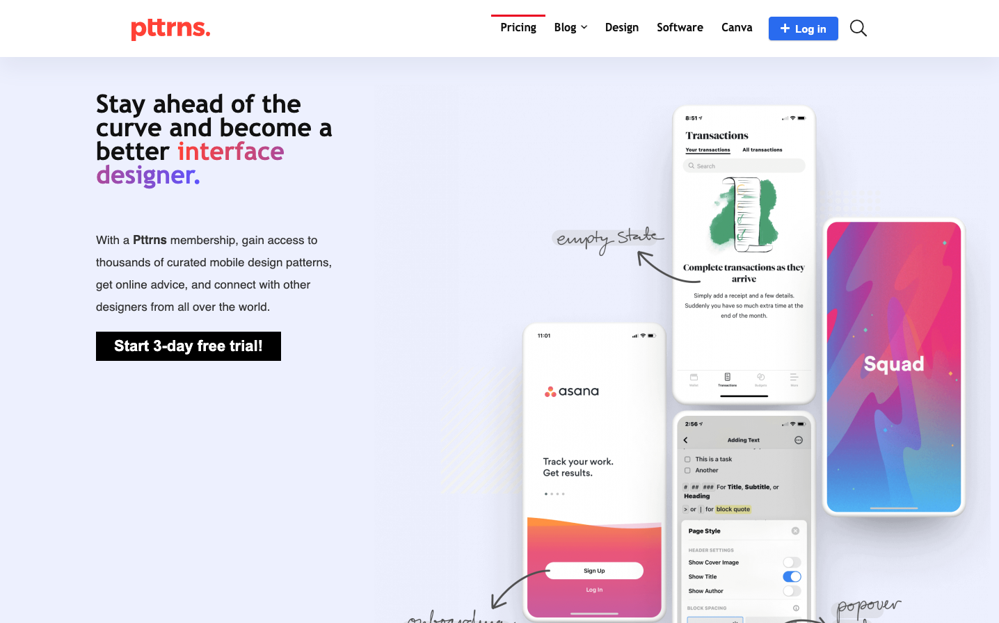 Pttrns embraces a bold, education-forward design aesthetic that feels like a premium design course meets mobile app showcase. The typography creates a confident learning hierarchy with mixed typefaces, while the vibrant red signature color projects creative energy and passion for design craft.
