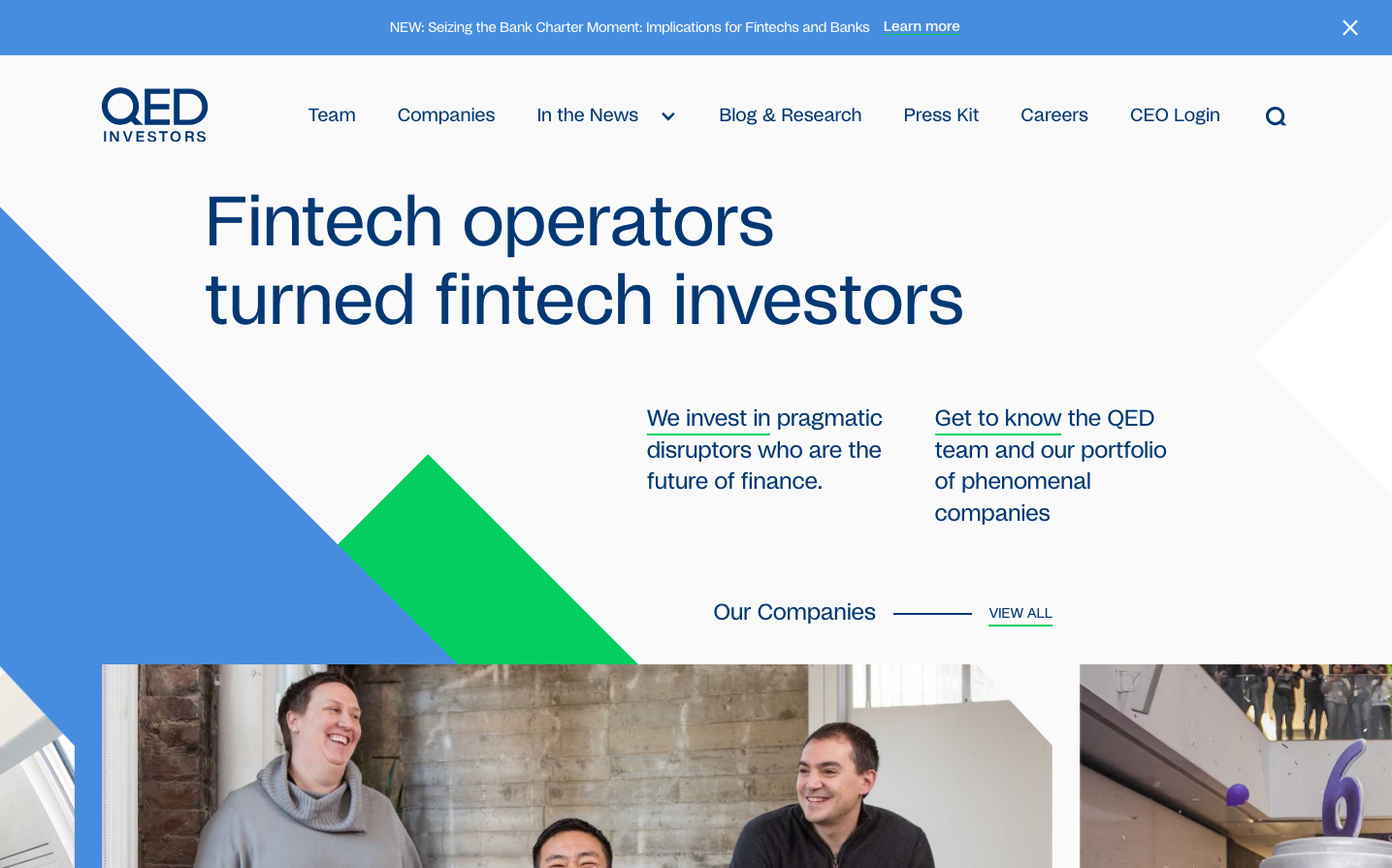 QED presents a sophisticated investment firm aesthetic built on a foundation of electric blue gradients and precise geometric forms. The Studio6 typeface creates an authoritative yet approachable voice, while the dramatic angular green accent element adds kinetic energy that suggests forward momentum in fintech innovation.