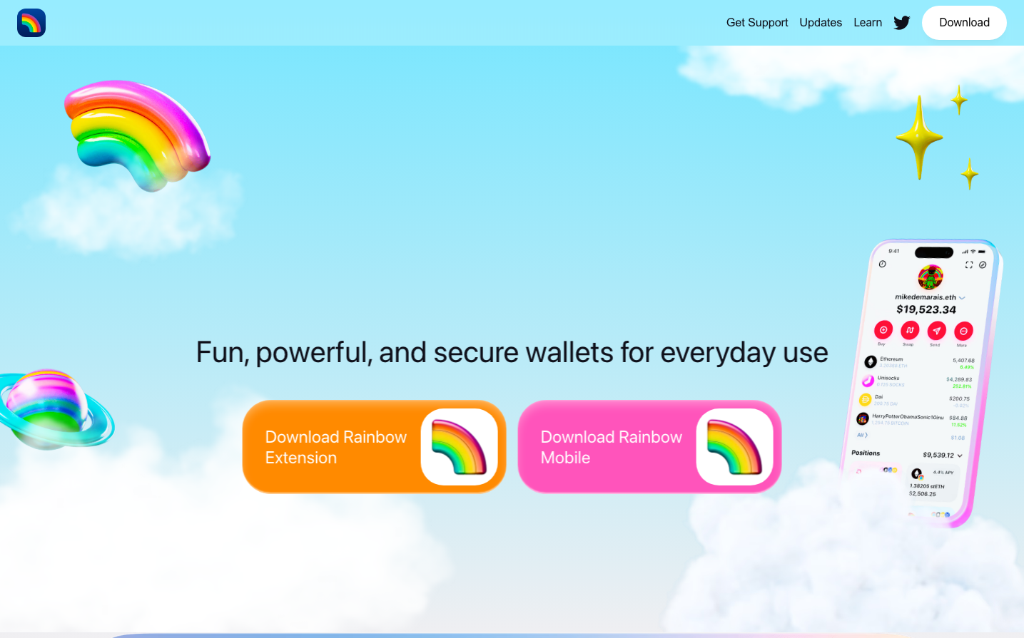 Rainbow creates a playful yet premium crypto wallet experience through glossy 3D rainbow elements against dreamy sky-blue gradients. The SF Pro Rounded typography feels approachable and friendly, while the floating geometric shapes and sparkling stars evoke magic and possibility in digital finance.